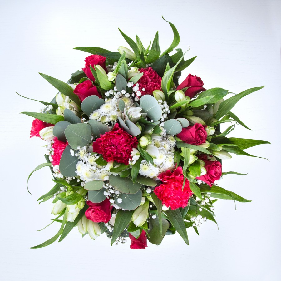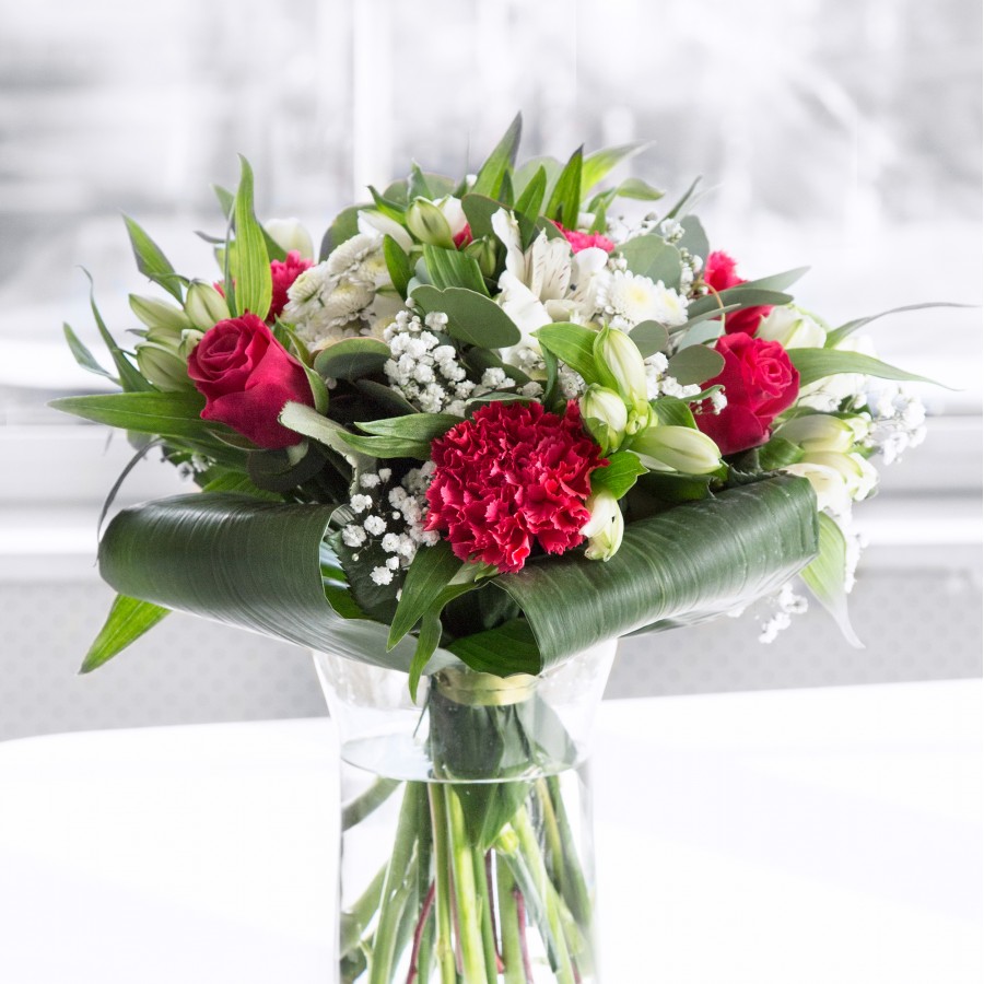 Celebrate special moments with our charming bouquet, artfully blending white chrysanthemums, delicate gypsophila, striking red roses, and playful carnations, complemented by white alstroemeria and elegant aspidistra leaves for a stunning display.